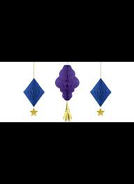 Get your party space ready for Ramadan/Eid with these Crescent Moon & Star Eid Honeycomb Decorations! This set of hanging decorations is made of paper and features two blue diamond-shaped decorations and one purple abstract shape. Attached to the bottom of the diamonds are a metallic gold crescent moon and a star. Decorate your party space for Ramadan/Eid al-Fitr or Eid al-Adha with these paper decorations! Product details: 3 per package Large decoration, 42cm/16 3/4in tall Small decoration, 28cm/11 1/4in tall Cardstock and tissue paper Include strings for hanging Arrive flat Simple assembly required